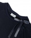 La felpa, impreziosita sul davanti dal nastro di cotone blu con lurex e un bottoncino, è lunga ed utilizzabile anche separatamente come abitino.