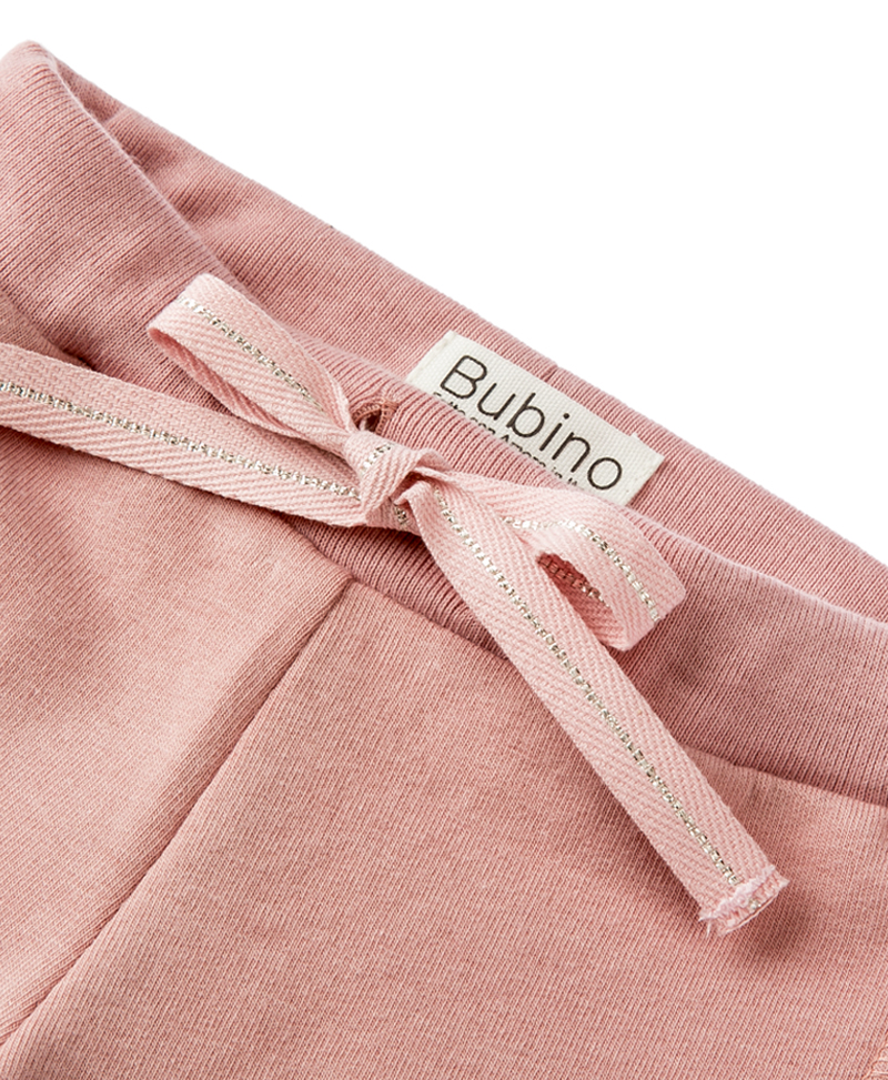 La felpa scaldacuore e il pantaloncino con elastico sono inpreziositi da un nastro in cotone rosa e lurex.