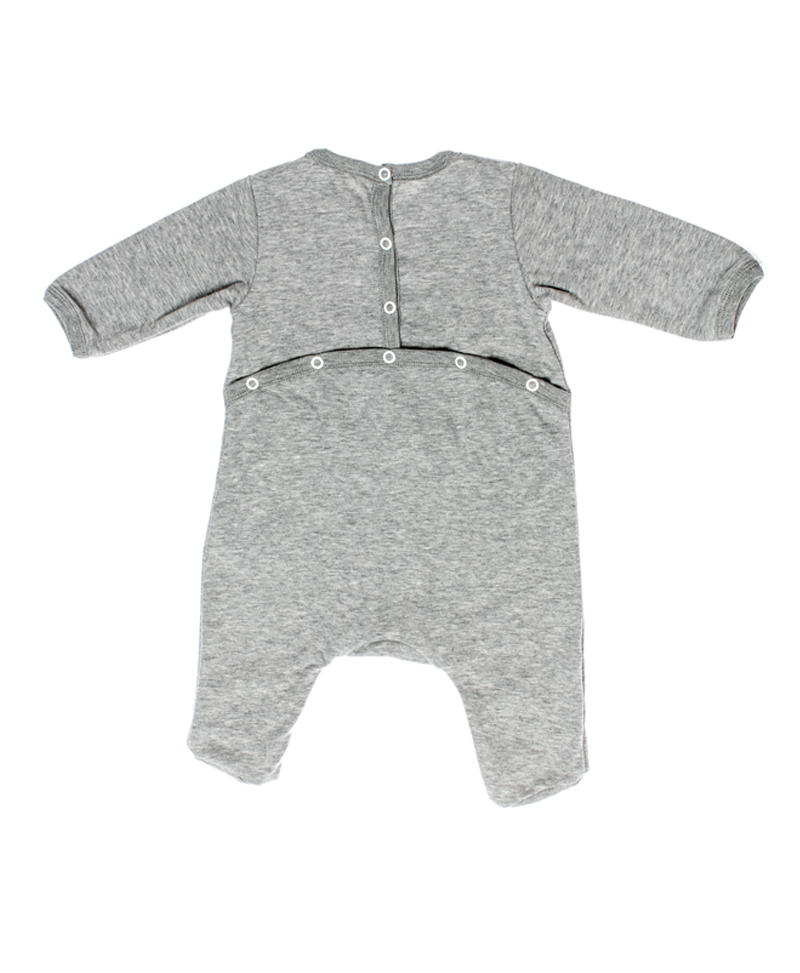 Tutina bebè in soffice jersey doppiato grigio melange e bianco con applicazione cuore realizzata a mano. Pratica apertura sul retrocon bottoncini a pressione.