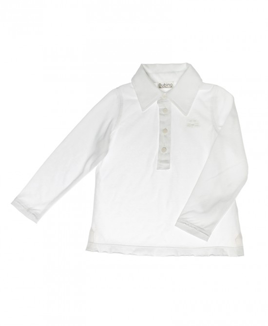 Polo in morbido jersey di cotone con manica lunga e ricamo bubino sul cuore. L’apertura sul davanti, il fondo e i polsini sono rifini dal taglio a vivo e lo spacchetto a lato รจ impreziosito da una fettuccia di cotone.
