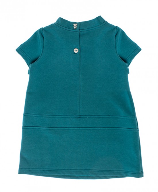 Abitino in morbida felpetta elasticizzata dalla forma a trapezio leggermente svasata, impreziosito da una cintura applicata sui fianchi con un pach ricamato Bubino.Un abitino per tutti i giorni dal design semplice ma raffinato.