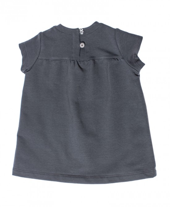 Abitino girocollo in morbida felpetta di cotone di colore grigio antracite, con gonna arricciata. Il capo รจ decorato con un nastro grigio antracite spinato e fiocco realizzato a mano. Apertura con due bottoncini sul retro, di cui uno a forma di Bubino.
